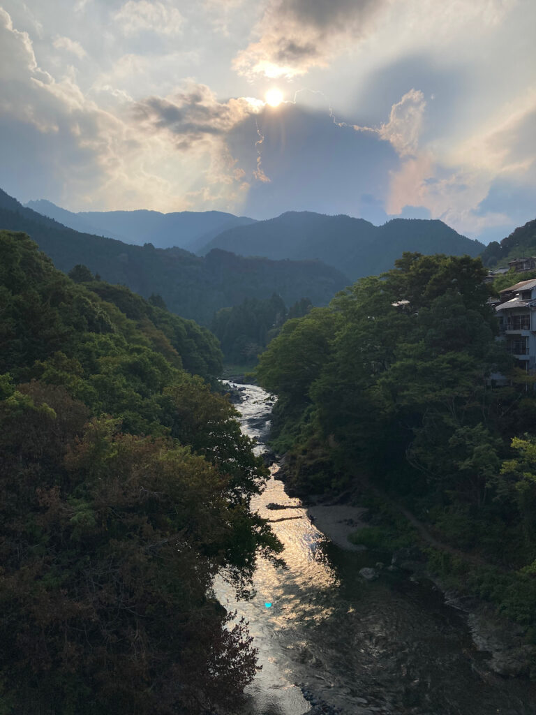 We bumped into the same group of high school students on the way back from the waterfall and they gave us a chorus of ‘Long time no see!’s and ‘Good job!’s. The path there was as tough to negotiate as the receptionist at the visitors’ centre had suggested – bare earth, tree roots, and precipitous steps made from boards and uprights of tough plastic painted brown and moulded to look like tree bark – so in order to save my still sensitive left knee, I suggested that we catch the cable car back down the mountain. Mr Brighton sampled another novelty food item (wasabi-flavoured ice cream) while we waited, and rather than catch the bus to Mt. Mitake Station, we walked the final couple of kilometres from the foot of the cable car. A train was leaving just as we walked towards the station and the next one would not depart for another 45 minutes. Then again, if we had caught the bus, we would have missed this wonderful view of the Tama River – quite a contrast to the views of Shibuya Scramble Crossing we had enjoyed 24 hours previously and compensation for the fact that it had, as is usually the case in summer, been far too hazy to see Mt. Fuji from the top of the mountain.